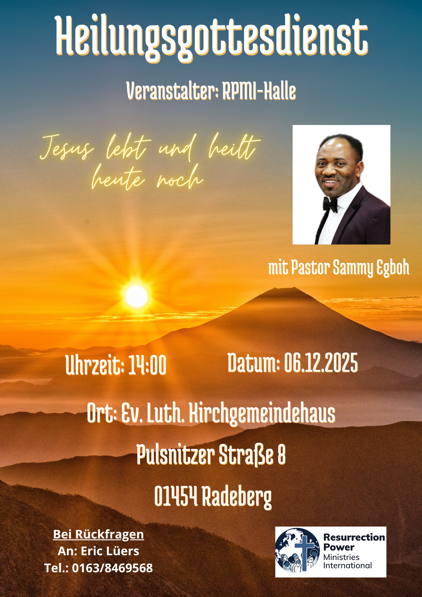 Was? – Heilungsgottesdienst mit Pastor Sammy Egboh Wann? – Samstag, den 6. Dezember 2025 um 14:00 Uhr Wo? – Ev.-Luth. Kirchengemeindehaus, Pulsnitzer Str. 8, 01454 Radeberg