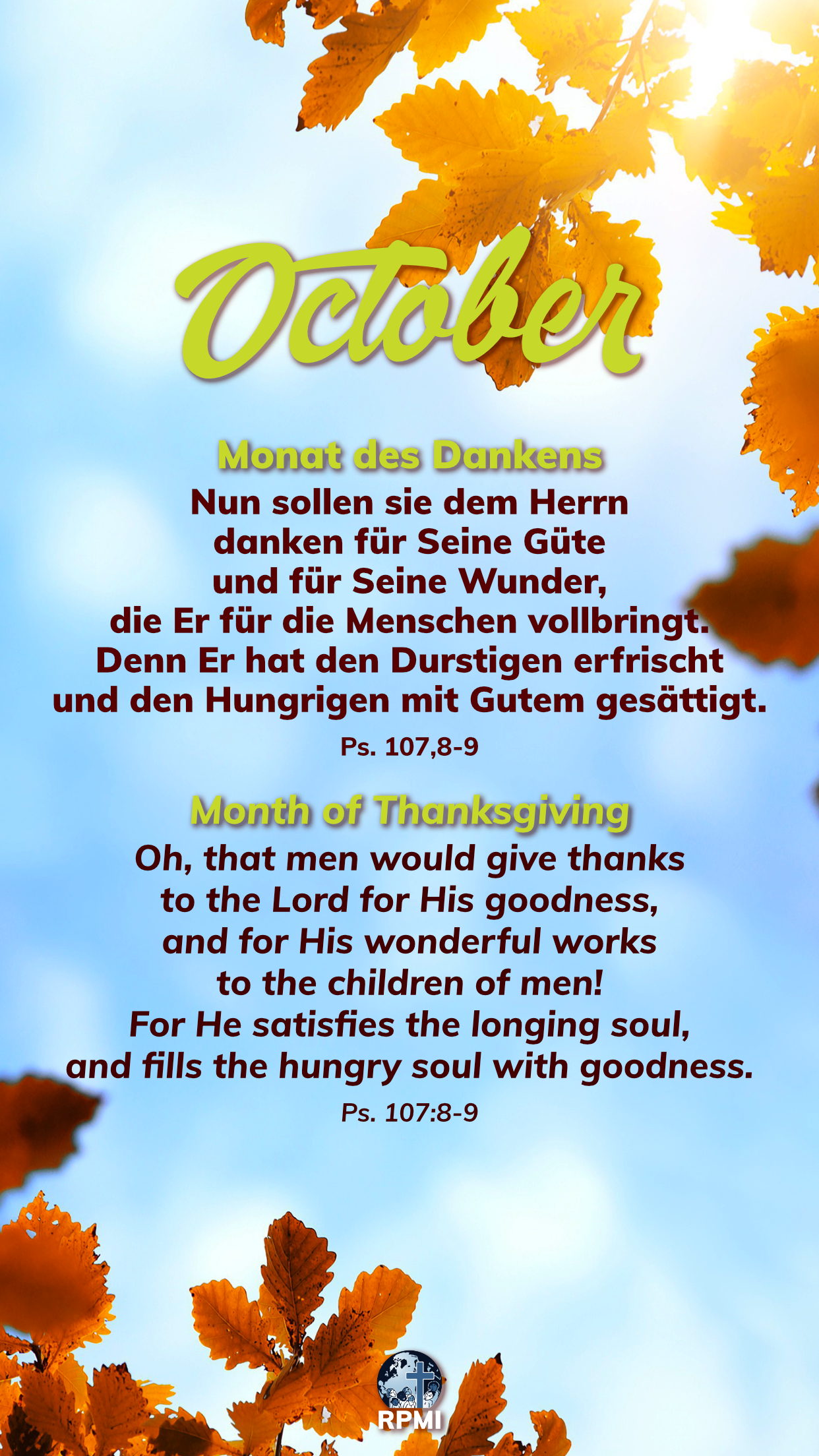 Liebe Geschwister, unsere Gebetswoche für den Monat Oktober hat begonnen. Lasst uns diesen Monat mit Danksagung füllen, denn unser wunderbarer Gott verdient unseren Dank. Wie immer ermutigen wir euch mit…