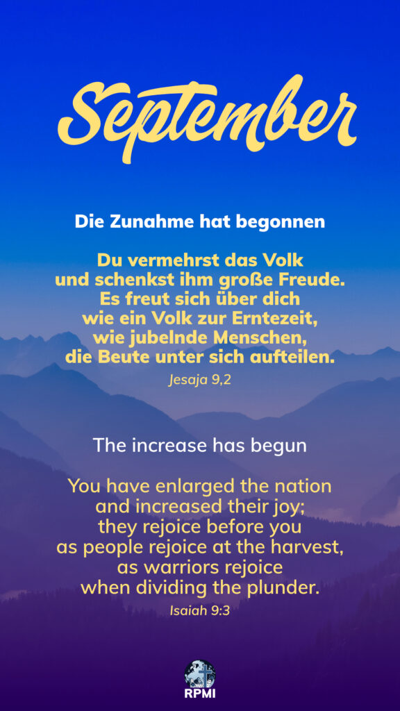 Diese Woche beginnt unsere Gebetswoche für den Monat September. Die Herrlichkeit, die wir erleben und in der wir wandeln, nimmt zu. Darüber dürfen wir uns als Gottes Volk freuen. Nehmt euch in dieser Woche Zeit, um von Gottes Herzen für diesen Monat zu hören. Wir ermutigen euch, je nach eurer Gnade und Möglichkeit und entsprechend der Führung des Heiligen Geistes mit uns zu fasten.
